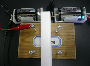 乾電池(多少消耗している)2個(直列),発砲ポリスチレン(スーパーで刺身等を乗せているもの)を幅2㎝,長さ15㎝に切ったもの)を使用(写真6)