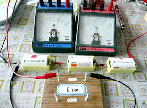 乾電池(多少消耗している)3個を直列につないで実験(写真5)