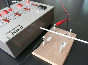 ◎ 電源装置(Nakamura児童用PS-50N)を電源として使用し,ストローを使って実験する場合,電熱線の長さは6㎝,電熱線は0.1㎜と0.3㎜,電圧は4V(A〜B)が最適である。