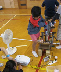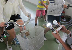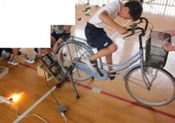 ・自転車で発電し,白熱電球,LED電球,CDラジカセ,扇風機を動かす。 |