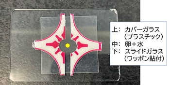 観察する際は,ワッポンを貼り付けたスライドガラスの上に,卵と水を滴下する(図2)。そして,カバーガラスをその上に乗せる。指でカバーガラスをずらせば,カバーガラスに接している卵は転がるので,様々な方向から胚を観察することができる。卵を観察する際には,上からライトを照らし(図3),メダカの卵を透過できるようにする(図4)。