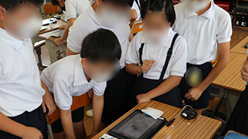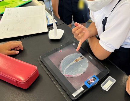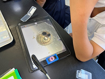 これまで,子どもたちが十分に時間を観察することができなかったメダカの胚の発生や稚魚の拍動について,一人一台端末とモバイル顕微鏡を活用することで,より明瞭に詳細まで観察することができた。