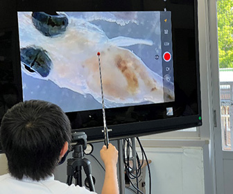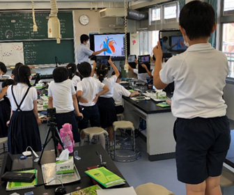 考察では,メダカの稚魚の拍動の様子から,ヒトの心臓の構造について議論が発展した。子どもから「6年生の教科書を見たい!」という声が上がるとともに,指導者が電子黒板でヒトの心臓の構造を紹介すると,一斉にその画面に注目し,理解しようとする姿が見られた。