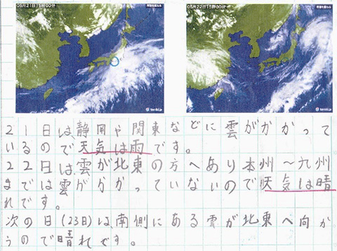 単元の終末には,ある日とその前日の雲画像を提示し,次の日の天気を予想する活動を行った。ほぼ全員がA児やB児のように,雲の様子を注意深く分析し,自分の言葉で天気を予想することができた。特別な支援が必要なC児も,次の日の天気の予想はできなかったものの,雲の様子をよく分析することができていた。