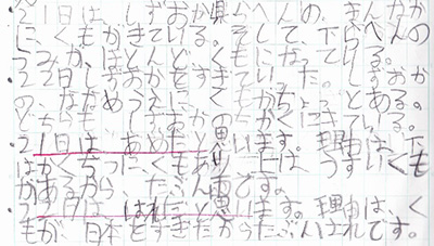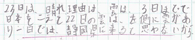 数名の子供たちは資料2のように,こちらがねらっているような雲の変化を捉えることができていなかった。しかしそのような子供たちも,雲の様子をよく見て,変化の様子を一生懸命考えていたため,ねらいである雲の変化を注意深く分析し変化を考えるという目的は達成されていたと考える。