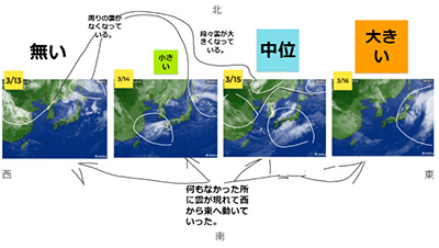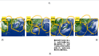 活用 当日までの連続した3日間の雲画像を分析し,次の日の天気を予想する。 |