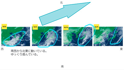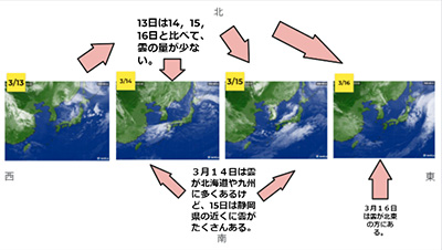 天気の変化のきまり 連続した4日間の雲画像をもとに,雲の動きの規則性を見出す。(本時) |