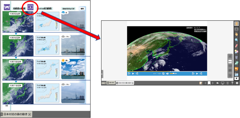最終確認として,デジタル教科書内にあるNICT(国立研究開発法人情報通信研究機構)の気象衛星の雲動画を視聴した。子供たちから,「やっぱり西から東だ!」「量も変化しているね。」などのつぶやきが聞かれ,話し合いで一般化した自分たちの考えを確認することができた。