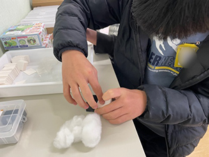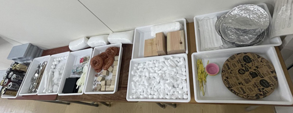 そして,同じ体積にすることを考えると,スプーンやおはしなどを同じ体積にすることができないことから,素材で比べる必要があることに気づき,同じ体積の素材を比べることになった。ここで,重さを比べたいものとして子どもからはいろいろな素材が出てきた。重さ比較用のブロックだけでは子どもの比べたいものには足りないため,発泡スチロールや紙など同じ体積になるように用意した。