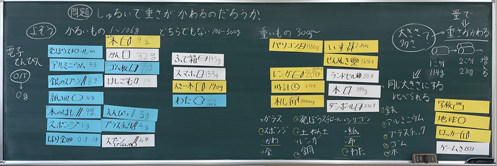 実験では,いろいろなものを取って来ては重さを量る姿が見られた。思っているよりも重かったり,軽かったりすることに驚いたり,重さを黒板のカードに書きに来たり,重そうなものは台ばかりを持って来て量ったりしていた。中には,教室にある時計を参観している教員に頼み取ってもらい量る姿や,机やいすの重さを量るために量り方を相談する姿が見られた。本校の台ばかりは4kgまでしか量ることができず,机の重さはそれよりも重かった。そこで,台ばかりを2台並べて机をのせて重さを量り,2台の台ばかりの示した重さを足し合わせることで,机の重さを量った。