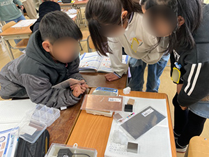 また,綿や土を調べられるように,同じ体積になるような器を用意し,綿や土を詰めて重さを量れるようにした。銅は同じ体積のものを用意できず,銅と鉄,アルミニウムの同じ大きさの板を用意し,3つで比べられるようにした。また,ガラスやレンガなどいくつかの素材については探してみたが用意できず,子どもには用意できなかったことを伝えた。用意できなかったものについては子どもも納得したようであった。子どもとともに授業を作っていくためには,子どもが自分たちの考えや思いが大切にされると思えることが大切であり,子どもが頼んだもので,用意できなかったものがあれば,子どもに説明し納得できるようにすることが大切である。