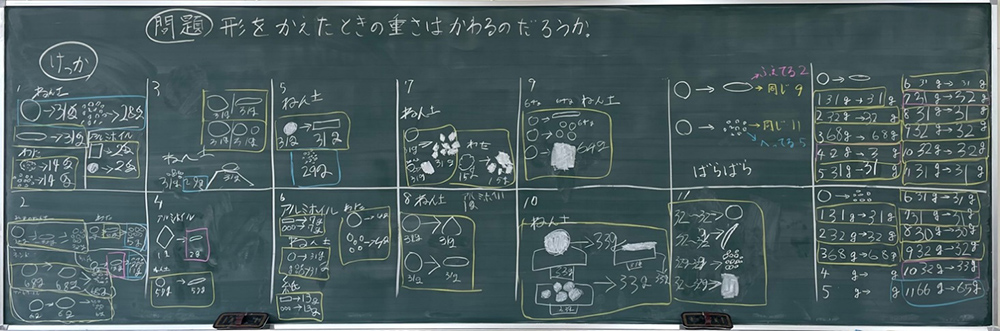 ものの形が変わると重さが変わるのかについての予想では,変わると考える子どもと変わらないと考える子どもがいた。その中で,変わらないと考える子どもから量が変わらなければという条件が出された。また,変わるという子どもからは,持ったときの感覚では軽くなった形として,小さく分けた形や細長くした形,平べったくした形が出され,重い形として丸めた形が出された。そこで,量は変えずに,4つの形の重さについて調べることになった。この時,調べられるものとして,粘土だけでなく画用紙やアルミホイルも形を変えられるものとして出されたため,用意するようにした。何を使うのかを子どもが選べるようにすることが大切であり,子どもは粘土だけでなく,画用紙やアルミホイルでも形を変えて重さを量っていった。