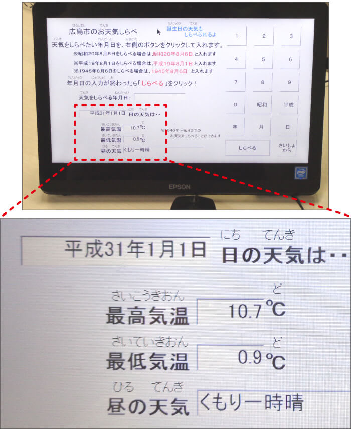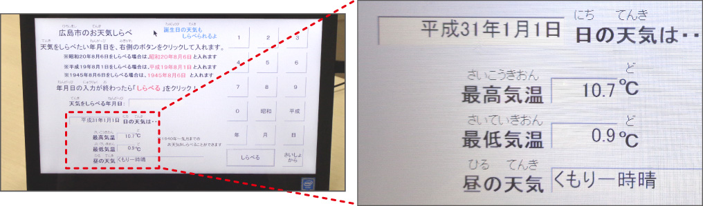 自分の誕生日(たんじょうび)に,広島市はどんな天気だったのかを調べられる「広島のお天気調べ」(1940年以降(いこう)が検さく可能です)も大人気。「ビデオコーナー」では,「水のたび」というビデオで,海面からじょう発し,雲,雨になり,森,川,海へじゅんかんする水のようすが音楽やえいぞうとともに学べるので,自由研究のテーマとしてもおすすめです。
