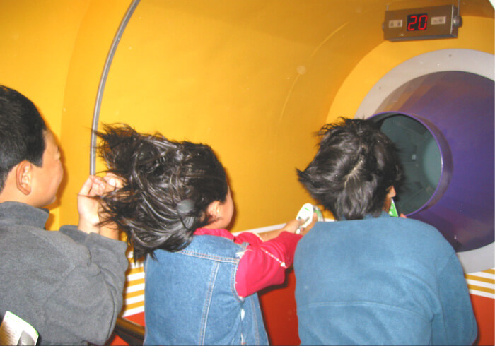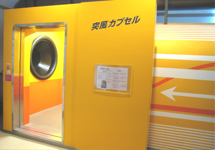 このカプセルに入ると,風速5m,10m,20mの風を体験できます。風速は「1秒につき何m動くか(m/s)」という単位で表します。気象庁の分類では風速20m/sの風は「非常に強い風」となります。突風カプセルで体験できる風速20m/sの風は,いったいどのような感じでしょうか。