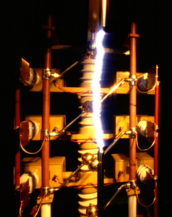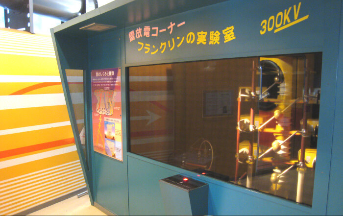 人工的に起こした30万ボルトの落雷(らくらい)実験を体験できます。ボルトとは,電圧を表す単位で,電気を押し出す力とも言えます。家庭で使われるふつうの電気の電圧が100V(ボルト)なので,30万ボルトがどれだけの大きな力かわかるでしょう。アメリカ独立宣言(どくりつせんげん)を書いた人のひとりと言われるベンジャミン・フランクリンは,雷は電気であるということを実験で証明した人です。