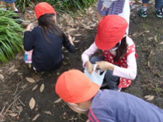 ・共通の体験を通して,全員が自分のどんぐりを持つことができるようにする。 ・拾った木の実などを保管する『秋の宝箱』を作り,自然の材料を集める意欲付けをする。 ![]() 夢中でドングリ拾いする様子 |