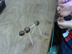 ・グループを編成して活動させることで,考えの交流をさせ協力して活動する態度を養う。 ・もっと楽しく遊べるように,ルールや約束を作ったり,工夫を考えたりしながら,活動を広げる。 ![]() どんぐりごまの看板 |