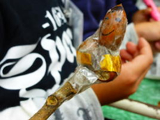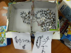 ・互いに伝え合い交流する活動を設定し,一人ひとりの気付きを全員で共有し,活動意欲を高めていく。 ・自分の作りたいものや遊びを作る活動に満足感をもたせ,「作ったものを見せたい。」「作ったもので一緒に遊びたい。」と他者との関わりに目を向けさせ次の活動へつなげていく。 →あきフェスタへのつながり ![]() ジュズダマの腕輪と指輪 |