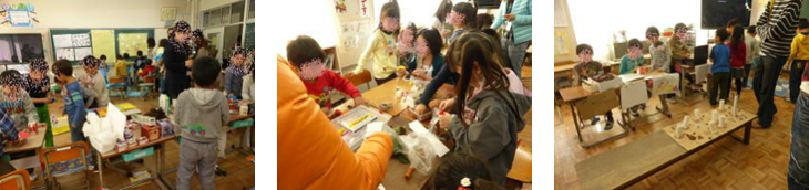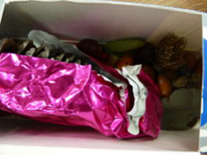 学年全員でどんぐり拾いに行った。子どもたちの袋の中は,たくさんのどんぐりやぼうし,いくつかのモミジやツバキの種でいっぱいになったので,それらを学校で保管するための入れ物を一人ひとりに準備させた。置き場所のことや,家庭での準備のしやすさを考え,牛乳パックを利用した。そして,「あきのたからばこ」の宝を増やそうと呼びかけ,その後の秋集めの意欲付けとした。子どもたちはそれを機に,いろいろな場所に目を向け始め,校庭や通学路,家の近くなどで木の実や葉っぱ,種を見つけては嬉しそうに「たからばこ」に入れ,秋見つけを楽しむことができた。