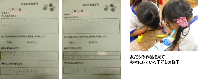 ・実際に作ったり遊んだりして感じた楽しさやうまくいかず困ったこと,次にやりたいことなどをシートに書き,活動を振り返り,表現する機会を設定し,次の活動へとつなげていく。 |