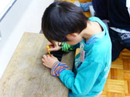 身近な素材のどんぐりではあるが,自分でコマを作ったり,飾りを作ったりした経験のある子どもは少なかった。経験が少ない上,難しいことに直面すると諦めやすいという実態があることから,作ることを楽しみ,作りたい物を作り上げることができるよう,活動時間をできるだけ確保した。また,穴を開けるための道具も,教師の手を貸さなくても使えるものを準備した。子どもたちは,実際に試しながら遊びを思いついたり,やり方が分かったりすることが多い。また繰り返し取り組むことで,道具を使いこなしたり,より良い工夫が思いついたりしていた。回数を重ねるごとに,作品や遊びが広がっていった。子どもたちにとって試行錯誤の時間が増えることは,自力解決の経験と,結果として自信を持たせることにつながった。