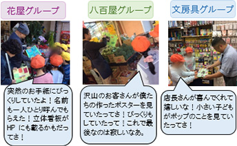 〇お店の人が笑顔になれる作戦を実行する。 ⇒各グループ,インタビューした店のために作ったものを渡しに行く。(パン屋グループはアイデアの提案のみ)