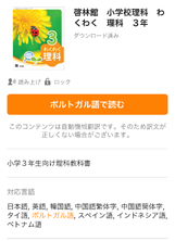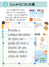 教科書の記述内容が,表題,本文,挿絵のすべて翻訳されている。児童の学習形態や母国語の習得状況に応じて【読み上げ】【ポップアップ表示】を選択することができる。