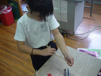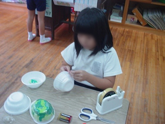 図3は,トコトコガメというおもちゃを作成している際に,甲羅に折り紙を小さくちぎって,1つずつテープで貼っている場面である。