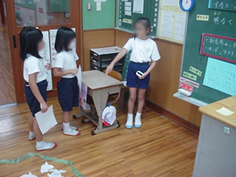 図6は,店員の練習をしている様子である。お客役の子どもと振り返りをしながら,高め合っている様子である。