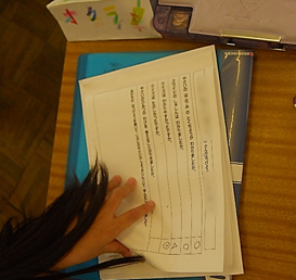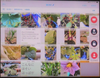 iPadで撮った写真を使って,野菜の生長に合わせた紹介文とクイズ作りをする。友だちからの言葉や観察等を通して気付いたことを「野菜ファイル」に付け加えていく。一人ひとりが自分の発見したことや友だちから学んだ事を付け加えることで,より自分の野菜を大切に,しっかり世話をしていこうという思いを強くもつことができると考える。