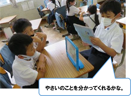 また,紹介したい場面の写真をもとに紹介文やクイズを作る活動を仕組む。同じ野菜同士の対話を通して,「何を紹介するのか」「どんなふうに紹介するのか」「なぜそうなっているのだろうか」などの観点で話し合い,修正等を行う。さらに,違う野菜を育てている友だちに紹介し,賞賛や修正をしていく。その際,1年生に分かりやすいかどうかを意識させた。