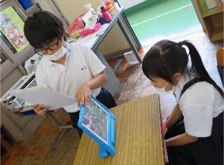 子どもたちは,自分の育てたい野菜を選んだ。自分で選んだ野菜だからこそ,野菜に対する愛情をより強くもつことができる。また,野菜の栽培活動を通して,生長の様子やそれぞれの野菜の生長の秘密を見付け,iPadを使って写真を撮り,蓄積しておく。それらを野菜絵本やクイズ作りの際に活用し,子どもたち同士や教師との協働や対話による学びを深め・広げるための交流活動や表現活動の有効な手段とした。