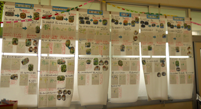 子どもたちは,毎日,観察などで気付いたことをカードに書き,帰りの会の「野菜ニュース」として発表した。日々の様子や発見などを簡単に書くカードと見る観点を決めてじっくりと観察するカードの2種類を使い,子どもたちの見付けた気付きをポートフォリオの形式で「野菜ファイル」に蓄積し,後で振り返りに活用できるようにする。また,野菜の本を教室に置き,いつでも必要なときに子ども自身で自由に調べられるようにしておく。