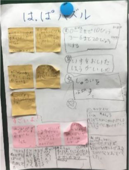 作る活動を2,3時間行った後,お試し遊びを互いにし,アドバイスを送り合った。子供は友達からの言葉に興味を示し,その意見をどのように反映させるかじっくり話し合う姿があった。この作戦会議の時間は,子供から要望があり急遽設定した時間である。さらにアドバイスを踏まえての工夫を,✩マークを使って記録したいと記録を残す工夫も出てきた。A児は1学期他者に対する関心が低く,一人で活動し,他者の意見を聞くことに必要性を特に感じていなかった。そのA児が,グループの輪に入り,友達からのアドバイスに目を向けている姿がみられ,他者と協力して取り組む楽しさや,意見を取り入れる良さを実感してきたように見られる。