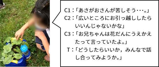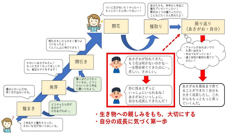 あさがおの生長の中で生じる困っていることや解決したいことを話し合い,自分の世話の仕方を見つめ直したり,友達にアドバイスしたりする場を設定した。気付きを伝え合い,自分とあさがおにとって適切な世話の仕方を自己決定できるようにした。また,枯れてしまうあさがおとの思い出を残す方法を全体で話し合い,アルバムやリース,写真撮影など,自分が納得のいく思い出の残し方について自己決定する場を設定した。