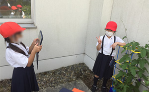 〇 ゲストティーチャー(公務補さん,2年生)のアドバイスをもとに,支柱立てや間引きを行う。 |