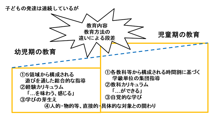 では,なぜ,小学校と幼稚園・保育所等の教師や保育士との間で,このようなズレが生じてしまうのでしょうか。それは,子どもたちの発達は連続しているものの,幼児期の教育と児童期の教育では,そもそも教育内容や教育方法が違うからです。