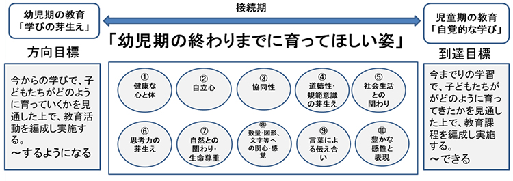 この「幼児期の終わりまでに育ってほしい姿」については,項目名だけではなく,「②自立心」で紹介したように10項目の内容についても一度目を通したいものです。また,幼稚園・保育所等及び小学校の教師・保育士だけで共有しているのは大変もったいないことです。就学時健康診断や入学説明会の折を捉えて,是非,保護者の方にもお伝えしてあげましょう。