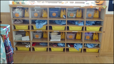右の写真は,上段が保育園のロッカー,下段が小学1年生のロッカーです。スタート期の子どもたちが自覚的に「自分の荷物を自分のロッカーに整理整頓することができる」ようにさせるためには,「自分の荷物を自分のロッカーに整理整頓するようになる」という,幼児期の姿を生かすようにします。「整理整頓がしてあると取り出しやすいなあ」とか,「みんなのロッカーが整頓されていると気持ちがいいなあ」などと,幼稚園・保育所等で味わってきた感覚を,スタート期にもう一度思い出させながら指導をするということです。とかく小学校の先生は,「ロッカーの整頓をしましょう」と指導し,やれていないと「きちんと整頓しなさい」と怒ります。そうではなく,小学校の先生方は,これまで子どもたちがどのように育ってきたのかについて思いを馳せ,その延長線上において,どのように声をかけたらよいのかについてしっかり考えて指導をしたいものです。「ゼロからのスタートじゃない」とは,そういうことです。到達目標としての「できる」のためには,まず方向目標としての「するようになる」経験を活かすとよいのです。