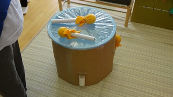画面に指示されたタイミングで,太鼓を叩く「太鼓の達人」のように見えませんか。右の方には,サイズの違う3つの缶で作られた太鼓と,どんぐりのバチが2本あります。これを作製した子どもは,缶の大きさによって出る音の質が違うことに気付いているのではないかと推測します。また左の方には,楽譜があります。①は「かんたん」,②は「ふつう」,③は「むずかしい」と書かれています。