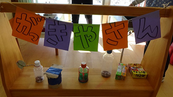 例えば,下の写真を見てください。これは,小学1年生「おもちゃづくり」の単元で作製したおもちゃです。何だか分かりますか。