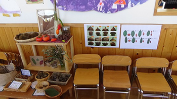 1枚目は,段ボールやラップの芯などで作った手作りの太鼓です。子どもたちは,保育園での生活で,バチでたたいて音を出して遊ぶ経験を自然にしているのでしょう。2枚目は,「がっきやさん」とあります。身近な物を使って音を出す経験をしたり,音の出るおもちゃを作ったりする経験をしているのでしょう。3枚目は,秋の自然を飾っています。この園の周辺は自然が豊かなので,子どもたちが収穫したものも飾ってあります。どんぐりについては,写真と図での説明もあります。