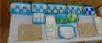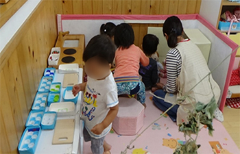 右の写真は,保育園で「おままごと」をしている写真です。よく見てみると牛乳パックで作ったトレイの中に,ペットボトルキャップが並んでいます。子どもたちはこの中にとってきたドングリを入れて,「1つ,2つ」と数を唱えながら遊んでいます。子どもたちは,こうした操作を通して数の感覚や概念を培っています。