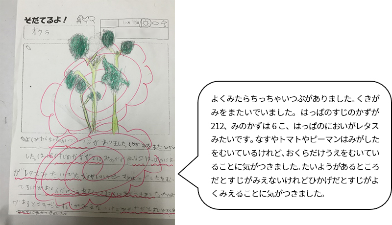細かい文法や文字の美しさは別にして,この子の気付きは素晴らしいと思いませんか。「くきがみをまたいでいました」「なすやトマトやピーマンはみがしたをむいているけれど,おくらだけうえをむいていることに気がつきました」という,この子ならではの表現からは,的確な事実認識,豊かな価値認識の姿の両面が見て取れます。子どもたちのワークシートを教室に貼っても,子どもたちはそれをしっかり見るわけではありません。ならば,こうしたワークシートについては書画カメラ等のICTを活用して,他の子どもたちに紹介してみてはどうでしょうか。教師が,気付きの良さを積極的に認めれば,子どもたちはうれしいものです。それが,友達同士の認め合いにも発展します。観察しても,気付きを書くことができない子どもにとってはお手本にもなります。また,この子のワークシートだけでなく,他の子どもたちのワークシートも紹介することで,大勢の気付きが集まり,教室はきっと「わ,ほんとだ!」などという声が飛び交い,栽培活動がより楽しく主体的なものとなるはずです。日々の栽培活動のなかで,継続的に写真に収めていれば,苗が育ち,花が咲き,実がつくといった生長の様子を(自分の成長とともに)トータルで理解することにも役立ち,これが理科の学習へと繋がります。また,こうした気付きは,ICT端末を活用して調べることにも発展させられます。なお,ICT端末の活用は,他にも次のような使い方が考えられます。