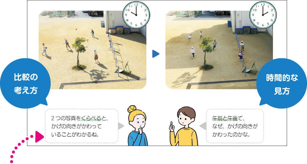 子どもたちが意識的に理科の見方・考え方をはたらかせられるよう、吹き出しの中に「見方・考え方マーカー」を引いています。見方・考え方をはたらかせた子ども主体の問題解決をさりげなくアシストすることで、深い学びの実現をサポートします。吹き出しの中で示すことで、見方・考え方をはたらかせることが、理科の学習の一部であることがわかります。