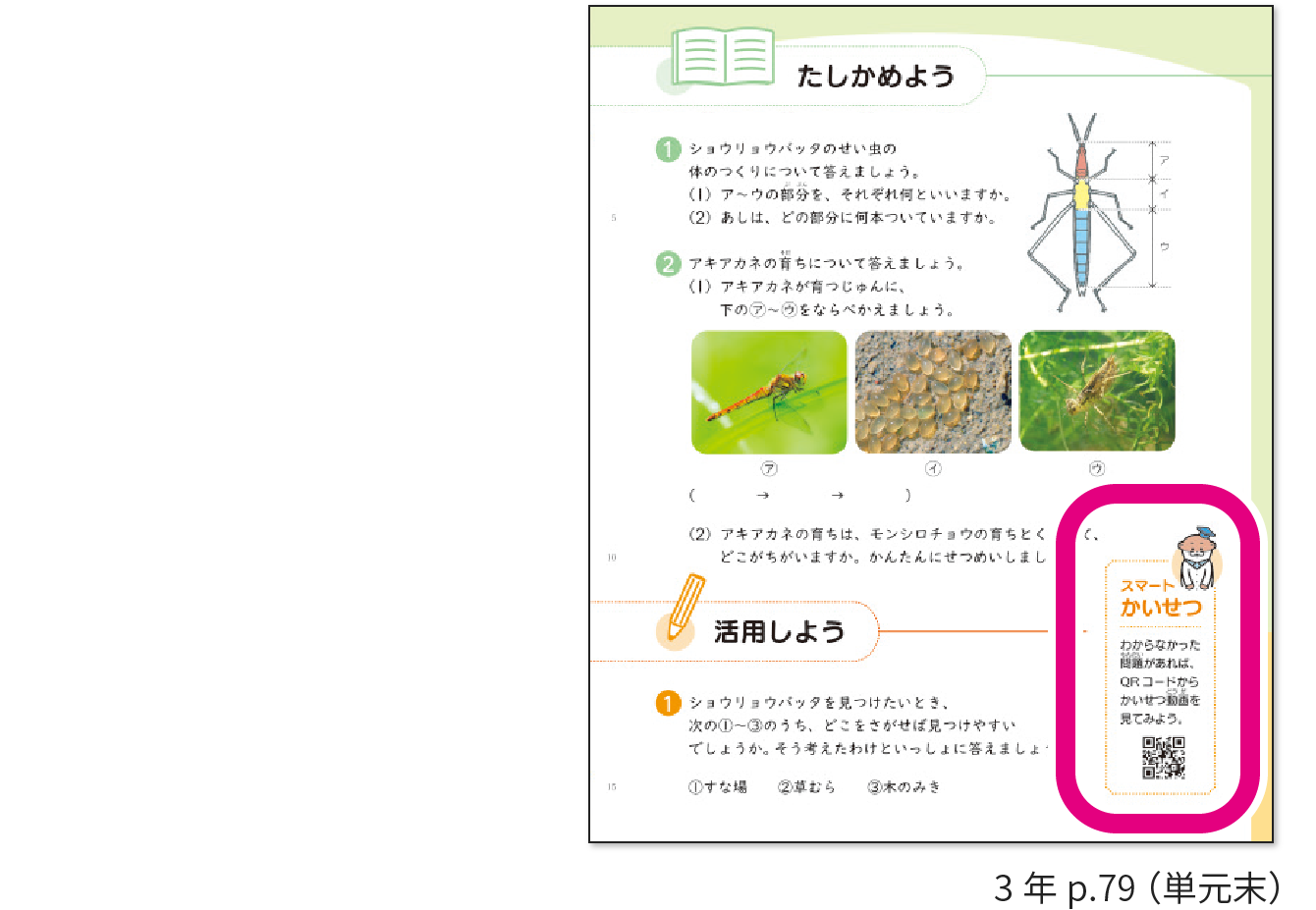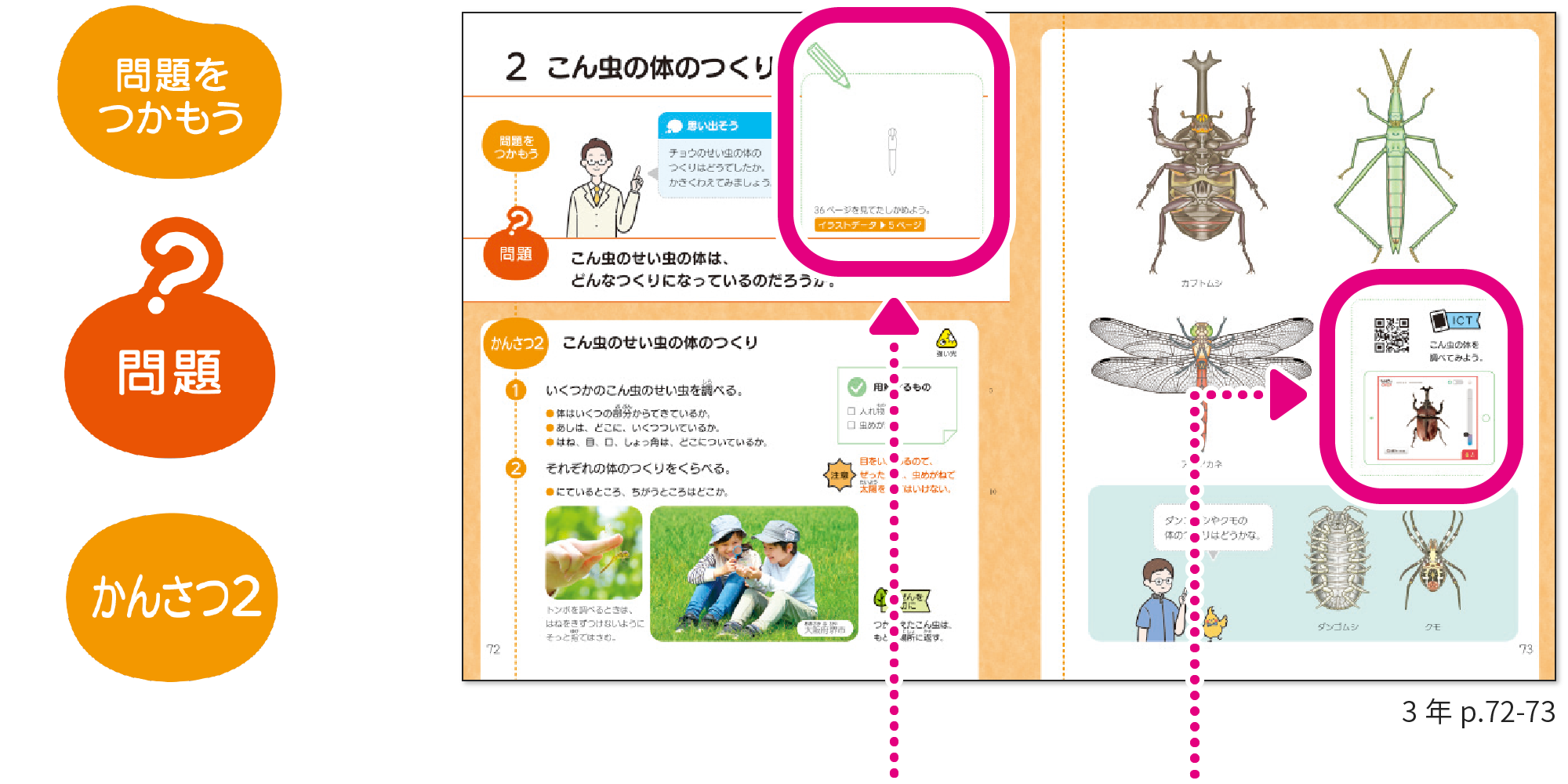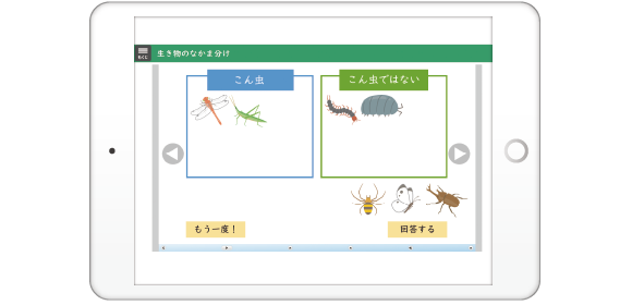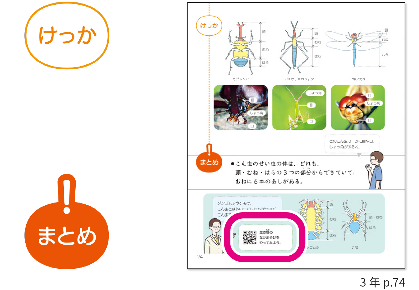 自分と友だちが調べた昆虫を、撮影した写真を見ながら話し合い、比較することで、協働的な学びが実現できます。学習データを保存しておくと、今後の学習の参考になります。また、学んだことを活用して、QRコンテンツ「生き物のなかま分け」をすると学びが深まります。