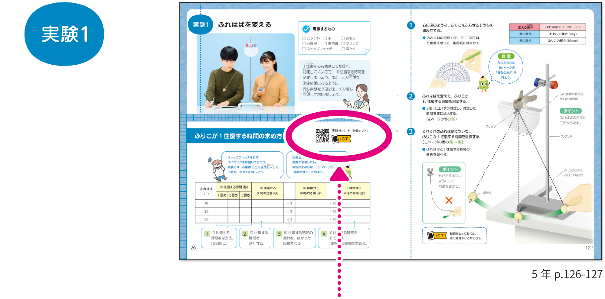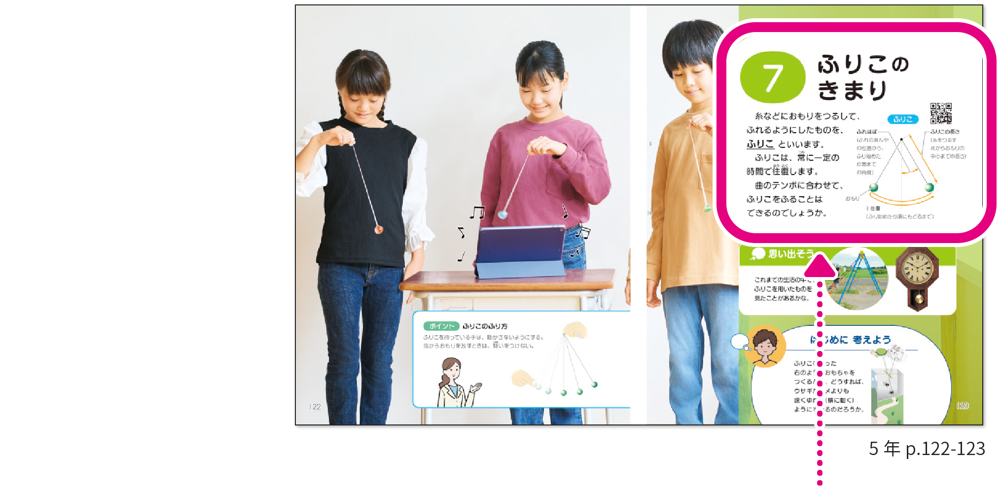 QRコードから曲を再生し、その曲のテンポに合わせて実際にふりこを振る活動を通して、問題を見いだすことができます。