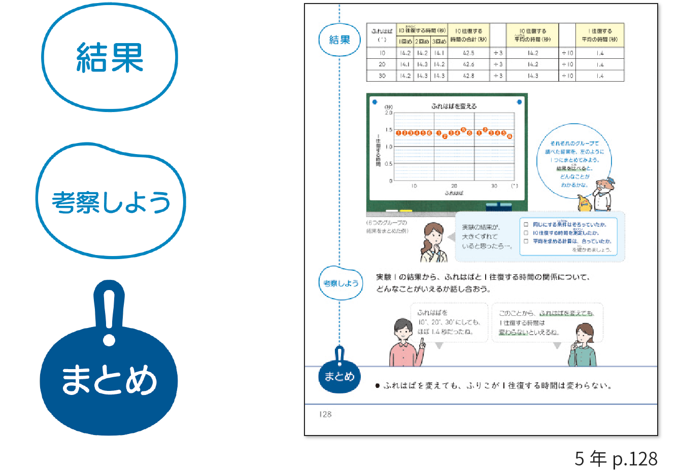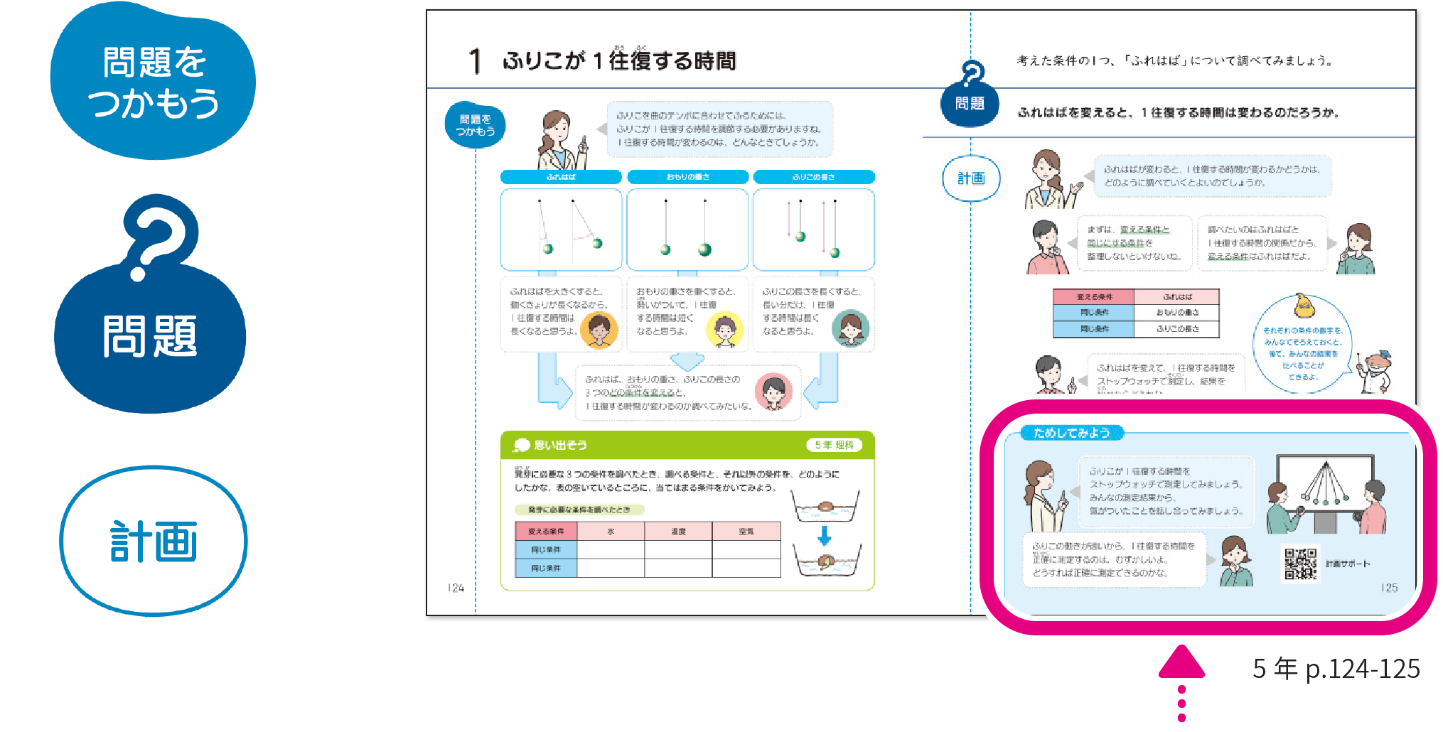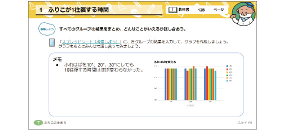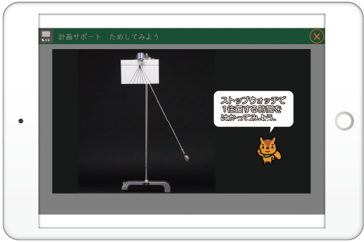 ふりこの動画コンテンツで、1往復する時間の調べ方をみんなで考え、計画できます。