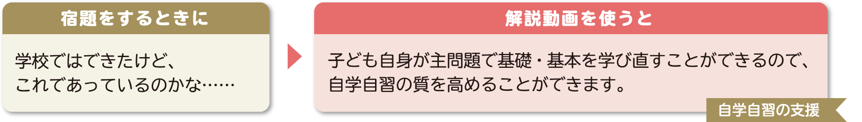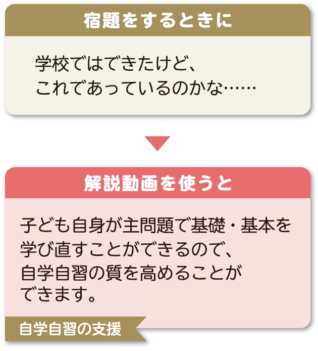 風邪などで学校を休んだときには、先生だけではなく児童自身や保護者にも学びもれの不安が残ります。「解説動画」なら家庭学習でも内容の理解を図ることができ、いつもの教科書を使って練習問題にも取り組ませることができます。