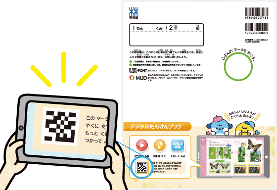 教科書の裏表紙にあるQ R コードを読み取るとデジタルたんけんブックを使用することができます。
